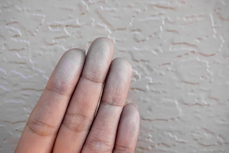 外壁の塗装が紫外線や直射日光、風雨などで劣化し、触れるとチョークの粉のように付着する状態です。
